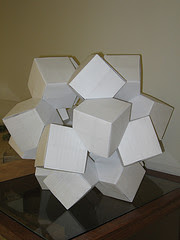 Dar mai mult decat a pleca de la analiza unei forme "ready-made",inseamna cu siguranta a te preocupa sa o confectionezi tu insuti conectand latura cu latura ori suprafata cu suprafata, un soi de puzzle tridimensional daca vreti,doar ca fiecare piesa este alcatuita de tine ,si toate sunt conectate fireste in functie de caracteristicile matematice ale formei redate.Ei bine acest lucru este posibil prin tehnica origami ,cea mai ieftina material si inventiva modalitate de a obtine rezultate atractive diverse in redarea constructiilor poliedrale...Origami in general este un omagiu adus frumusetii geometriei,indiferent de ce domeniu al acestei tehnici ar fi vorba!